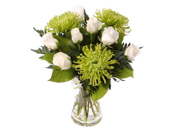 Kaunis, valkoisista ja vihreistä kukista sidottu kimppu